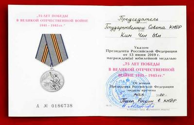 Am 5. Mai gab es in der Kongresshalle Mansudae in Pyongyang eine Zeremonie zur Verleihung der Gedenkmedaille zum „75. Jahrestag des Sieges im Großen Vaterländischen Krieg 1941 – 1945“.