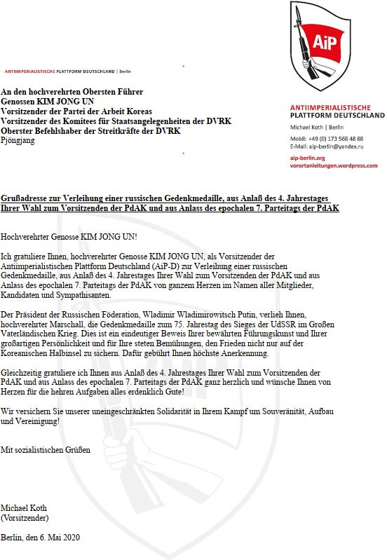 Aus Anlass der historischen Verleihung der Gedenkmedaille zum 75. Jahrestag des Sieges der UdSSR im Großen Vaterländischen Krieg an den hochverehrten Obersten Führer Marschall KIM JONG UN, Vorsitzender der Partei der Arbeit Koreas, Vorsitzender des Komitees für Staatsangelegenheiten und Oberster Befehlshaber der Streitkräfte der Demokratischen Volksrepublik Korea durch den Präsidenten der Russischen Föderation, Wladimir Wladimirowitsch Putin gratulierten wir dem geliebten Marschall KIM JONG UN auf das Herzlichste. Dieses bedeutsame Ereignis zeigt die Kontinuität von vielen Jahrzehnten der Freundschaft zwischen dem koreanischen und den Völkern Russlands. Die Freundschaft zwischen dem Großen Führer Genossen KIM IL SUNG und Generalissimus J. W. Stalin wie aber auch die Freundschaft zwischen dem geliebten Führer Genossen KIM JONG IL und den hervorragenden Vertretern der Sowjetführung wie Juri Andropow, Konstantin Chernenko und Gospodin-Towarischtsch Putin zeigen die Kontinuität und Flexibilität der Beziehungen zwischen zwei nicht-kapitalistischen fortschrittlichen Staaten. In der Gegenwart führt der geniale Genosse KIM JONG UN dieses Werk in die lichte Zukunft der Menschheit und zum endgültigen Niedergang des Imperialismus und Kapitalismus.