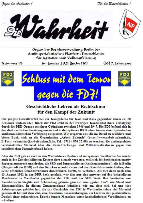 Hinterlasse einen Kommentar | Schlagwörter: 1923, 1930, 1945, 5. Anton, 95, Ackermann, AiP, AiP-D, Angriff, Antiimperialistische Plattform, Antiimperialistische Plattform Deutschland, Antiimperialistische Plattform Deutschlands, Übergriff, Übergriffe, Bei Freunden gefunden, Berlin, Broschüre, DDR, Demo, Demokratische Volksrepublik Korea, DVR Korea, DVRK, Führer, FDJ, Genosse, Genossen, Gewalt, Imperialismus, Jugend, Kampf, Karl, KDVR, Kim Jong Un, Kinder, Korea, Koreanische Demokratische Volksrepublik, KPD, Lenin, Liebknecht, LLL-Demonstration, Luxemburg, Nord-Korea, Nordkorea, Nr. 95, Pjöngjang, Polizei, Polizeistaat, Pyongyang, Radek, Revolution, Rf, Rosa, Rote Fahne, SBZ, Schlageter, SED, Souveränität, Sozialismus, Unabhängigkeit, Vaterland, Volk, Volksmassen, Wahrheit | Veröffentlicht inAgitprop, Analyse, BRD, Gesellschaft, Imperialismus, Korea, Meldungen, Nachrichten