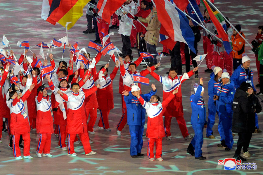 Die an dieser Winterolympiade teilnehmenden Sportler und anderen Personen aus den verschidenen Ländern und Regionen wie die Olympiamannschaften aus Nord und Süd traten ins Olympiastadion ein. Da jubelte das Publikum ihnen mit stürmischem Beifall zu.