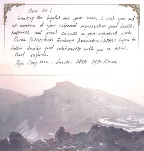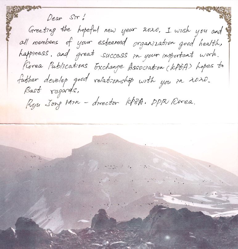 Das neue hoffnungsvolle Jahr 2020 grüßend wünsche ich Ihnen und allen Mitgliedern Ihrer geschätzten Organisation Gesundheit, Glück und großen Erfolg in Ihrer wichtigen Arbeit. Die Koreanische Gesellschaft zum Austausch der Publikationen (KPEA) hofft auf eine weitere Entwicklung der guten Beziehung mit Ihnen in 2020.
