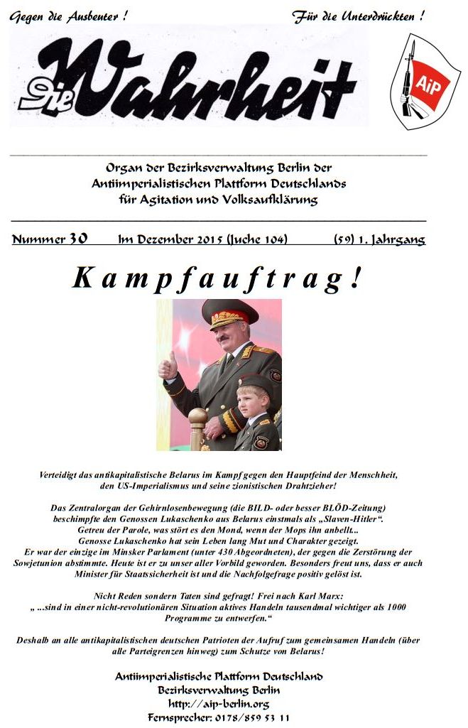Hinterlasse einen Kommentar | Schlagwörter: 30, Alexander Grigorjewitsch Lukaschenko, Alexander Lukaschenko, Aljaksandr Ryhorawitsch Lukaschenka, Belarus, Belorussland, Bild, BILD-Zeitung, BLÖD, BLÖD-Zeitung, Die Wahrheit, Die Wahrheit Nr. 30, Frage, Gehirnlosenbewegung, Hauptfeind, Kampfauftrag, Karl Marx, lies Die Wahrheit, Lukaschenka, Lukaschenko, Menschheit, Minister für Staatssicherheit, Minsk, Minsker Parlament, Nachfolge, Nachfolgefrage, Parlament, Patriot, Patrioten, patriotisch, Patriotismus, Sowjetunion, US-Imperialismus, US-Imperialisten, Wahrheit, Wahrheit 30, Wahrheit Nr. 30, Weissrussland, Willst du Klarheit, Willst du Klarheit – lies „Die Wahrheit“, Zentralorgan, Zionismus, Zionisten | Veröffentlicht inAgitprop, Belarus, Geopolitik, Willst du Klarheit – lies „Die Wahrheit“
