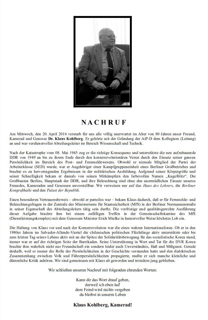 Anfang Mai fand auf einem Berliner Friedhof die bewegende Trauerfeier und Beisetzung unseres Genossen und Weggefährten Dr. Klaus Kohlberg (Gründungsmitglied der AiP-D, Mitglied der Leitung [Kollegium] und Abteilungsleiter Post- und Fernmeldewesen) statt. Neben den Angehörigen des teuren Verstorbenen, Freunden und Genossen nahm auch ein Vertreter der Botschaft der DVR Korea in der BRD daran teil.