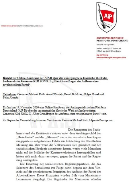Hinterlasse einen Kommentar | Schlagwörter: AiP, AiP-D, Antiimperialistische Plattform, Antiimperialistische Plattform Deutschland, Antiimperialistische Plattform Deutschlands, Aufbau, Bericht, Broschüre, Buch, Datei, Demokratische Volksrepublik Korea, download, DVR Korea, DVRK, Führer, Genosse, Genossen, Grundfragen, Heft, herunterladen, Internet, Juche, Juche-Ideologie, Kampf, KDVR, Kim Il Sung, Kim Jong Il, Kim Jong Un, Korea, Koreanische Demokratische Volksrepublik, laden, Nation, Nord-Korea, Nordkorea, Partei, Partei der Arbeit Koreas, PdAK, pdf, Pjöngjang, Pyongyang, Revolution, Seminar, Souveränität, Sozialismus, Studium, Unabhängigkeit, Vaterland, Volk, Volksmassen, Werk | Veröffentlicht inAgitprop, Analyse, Asien, Geopolitik, Gesellschaft, Imperialismus, Korea, Meldungen, Nachrichten
