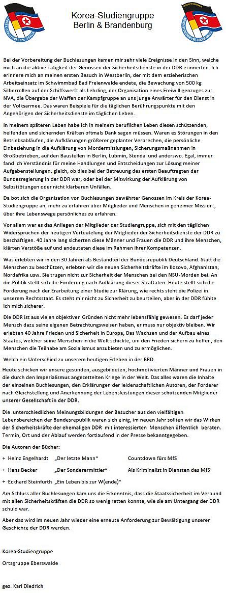 Hinterlasse einen Kommentar | Schlagwörter: a.D., AiP, AiP-D, Als, Als Kriminalist, Antiimperialistische Plattform, Antiimperialistische Plattform Deutschland, Antiimperialistische Plattform Deutschlands, Autor, Becker, BRD, Buch, Buchautor, Buchlesung, Buchvorstellung, Countdown, DDR, Demokratische Volksrepublik Korea, der, des, Diedrich, Diensten, Diskussion, DVR Korea, DVRK, Engelhardt, Erich, fürs, Fotodokumente, Fotos, Generalmajor, Genosse, Genossen, Hans, Hans Becker Der, Heinz, in, JVA, Karl, KDVR, Konterrevolution, Korea, Koreanische Demokratische Volksrepublik, Koth, Lesung, letzte, Mann, MfS, Michael, Mielke, Ministerium für Staatssicherheit, Moabit, Nord-Korea, Nordkorea, Revolutionär, Sonderermittler, Sozialismus, Vorsitzender | Veröffentlicht inAgitprop, Analyse, BRD, Europa, Geopolitik, Gesellschaft, Imperialismus, Meldungen, Nachrichten