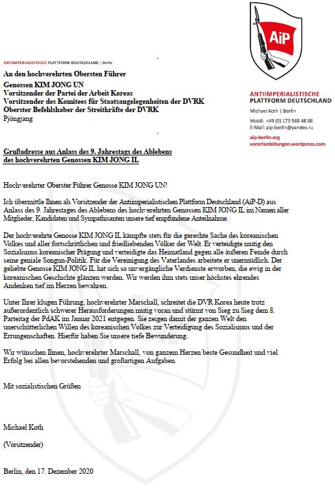 Hinterlasse einen Kommentar | Schlagwörter: AiP, AiP-D, Antiimperialistische Plattform, Antiimperialistische Plattform Deutschland, Antiimperialistische Plattform Deutschlands, Berlin, Brandenburg, Demokratische Volksrepublik Korea, Dichter, DVR Korea, DVRK, Erinnerung, Führer, Geburtstag, Generalissimusse, Genosse, Genossen, Glückwünsche, Grußadresse, Grußadressen, Grußbotschaft, Grußbotschaften, Jcuhe-Studiengruppe, Juche, Juche-Ideologie, Kampf, Kandidat, KDVR, Kim Hyong Jun, Kim Il Sung, Kim Jong Il, Kim Jong Un, Korea, Korea-Studiengruppe, Koreanische Demokratische Volksrepublik, Koth, Michael, Michael Koth, Mitglied, Nation, Nord-Korea, Nordkorea, Partei, Partei der Arbeit Koreas, PdAK, Persönlichkeit, Pjöngjang, Politbüro, Politik, Pyongyang, Revolution, Souveränität, Sozialismus, Unabhängigkeit, Vaterland, Volk, Volksmassen, Vorsitzender, ZK | Veröffentlicht inAgitprop, Analyse, Asien, Geopolitik, Gesellschaft, Korea, Meldungen, Nachrichten