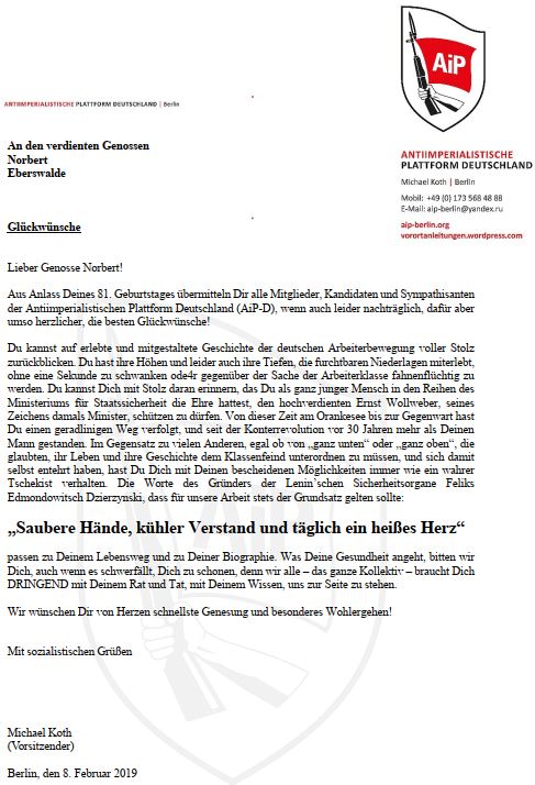 Am Donnerstag, den 22.06.d.J. besuchte eine Delegation der Antiimperialistischen Plattform Deutschland (AiP-D) unter Leitung ihres Vorsitzenden Genossen Michael Koth gemeinsam mit S. E. dem Außerordentlichen und Bevollmächtigten Botschafter der DVR Korea in der BRD, Genossen Pak Nam Yong, und seinem Stellvertreter den ehemaligen Bezirk Frankfurt/Oder mit dem Ziel Golzow, das die historische Stätte des Besuches des verehrten Genossen Kim Il Sung im Jahre 1984 war. Der Delegation der AiP-D gehörten an: der Stellvertretende Vorsitzende, die Abteilungsleiter Ideologie, Landwirtschaft und Forsten, Wissenschaft und Technik, Singebewegung und Personenschutz.