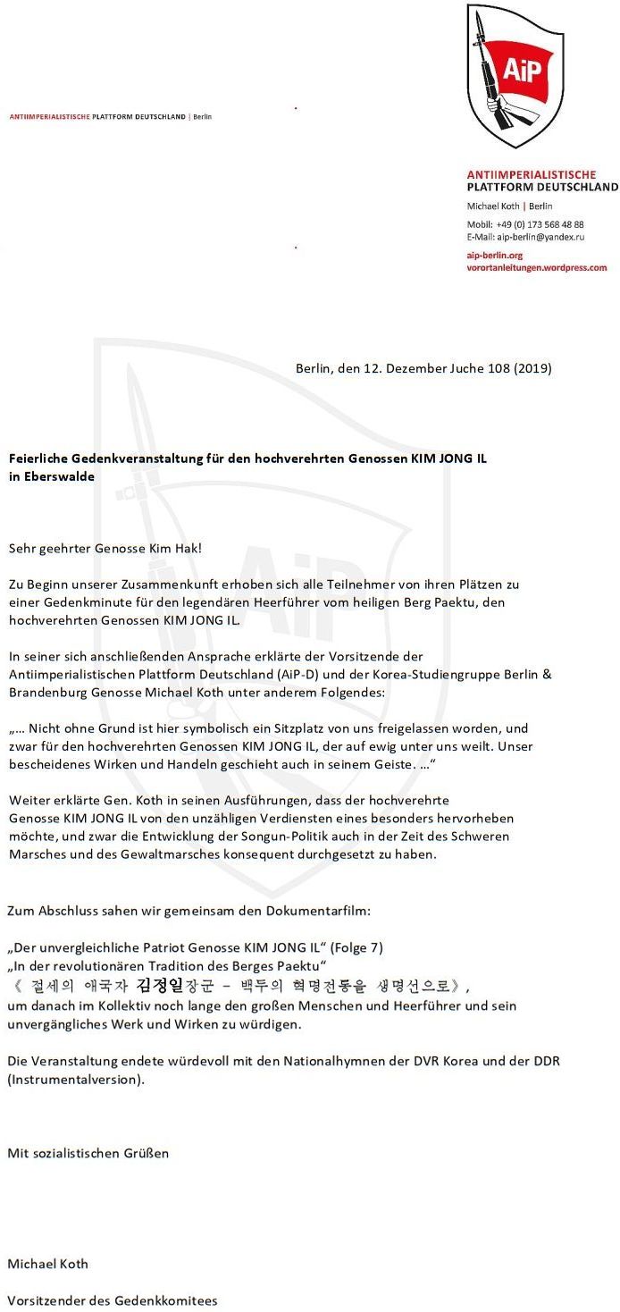 Hinterlasse einen Kommentar | Schlagwörter: 13, AiP, AiP-D, Antiimperialistische Plattform, Antiimperialistische Plattform Deutschland, Antiimperialistische Plattform Deutschlands, Armee, Botschaft, Botschafter, Dank, Dankschreiben, Demokratische Volksrepublik Korea, DVR Korea, DVRK, Gedenkveranstaltung, Genosse, Juche, Juche-Ideologie, Kampf, KDVR, Korea, Koreanische Demokratische Volksrepublik, Koreanische Volksarmee, KVA, Nation, Nord-Korea, Nordkorea, Nr., Pak Nam Yong, Partei, Partei der Arbeit Koreas, PdAK, Souveränität, Sozialismus, Taifun, Unabhängigkeit, Vaterland, Veranstaltung, Volk | Veröffentlicht inAgitprop, Analyse, Asien, Geopolitik, Gesellschaft, Korea, Meldungen, Nachrichten