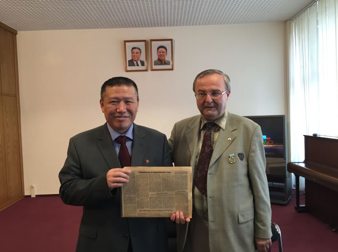Der Delegation gehörten u. a. der Stellvertretende Vorsitzende der AiP-D und Chefredakteur der Wahrheit, der Abteilungsleiter Volksbildung, der Abteilungsleiter Singebewegung, der Stellvertretende Abteilungsleiter Personenschutz (gleichzeitig zuständig für patriotische deutsche Musik) und weitere verdiente Genossen an. S. E. der Genosse Botschafter informierte uns über die von den US-Imperialisten und ihren Lakaien hervorgerufene äußerst angespannte Lage auf der Koreanischen Halbinsel und die selbstverteidigenden Maßnahmen der DVR Korea. Seine Ausführungen wurden mehrfach spontan von Beifall unterbrochen. Unser Vorsitzender betonte unsere uneingeschränkte Solidarität mit dem verehrten Marschall Kim Jong Un, der Regierung der DVR Korea und dem koreanischen Volk in seinem unermüdlichen Kampf um Gerechtigkeit, Selbstbestimmung und Vereinigung des Vaterlandes. Unser Vorsitzender sagte auch, dass es heute für deutsche Genossen darum geht, nicht die Vergangenheit unendlich zu bemühen und in gegenseitige Vorwürfe zu verfallen, sondern frei nach der Nationalhymne der DDR… „und der Zukunft zugewandt“ nach vorne zu schauen. D. h. in der gegenwärtigen Etappe, dass wir JEDEM die Bruderhand reichen, der unsere Forderung „BRD raus aus NATO und EU“ unterstützt! S. E. der Botschafter beglückwünschte unseren Vorsitzenden zu dieser klaren Haltung.