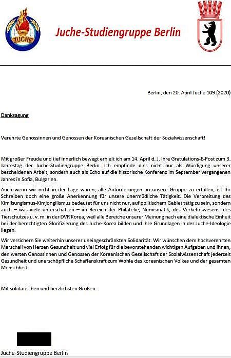 Zum 3. Jahrestag ihres Bestehens bekam mit tiefem Dank der Vorsitzende der Juche -Studiengruppe Berlin am 14. April Juche 109 (2020) ein bedeutsames Schreiben aus Korea per E-Post: