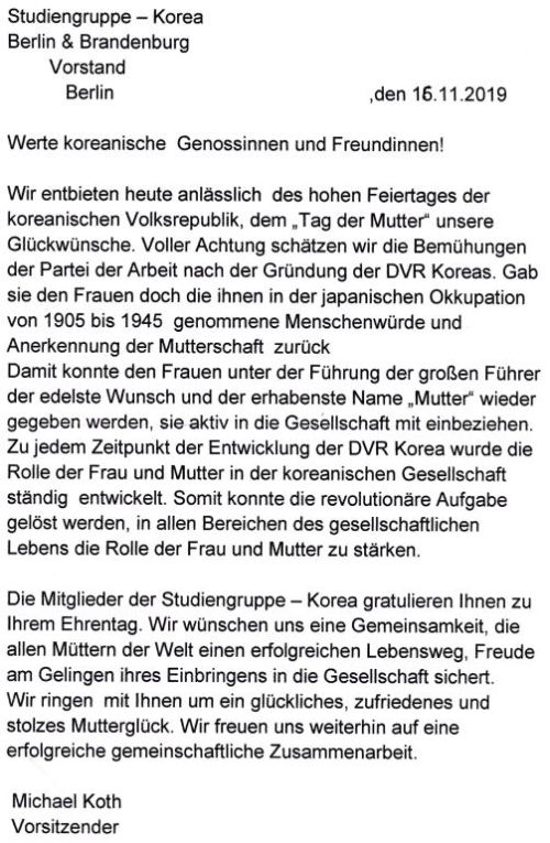 - Das Gespräch des Leiters der Frauenkommission, Genossin Agnes Grüning, mit S. E. dem Genossen Botschafter, das wahrlich auf Augenhöhe geführt wurde, ist der aktive Beweis, dass unsere koreanischen Freunde für alle Fragen ein offenes Ohr haben.