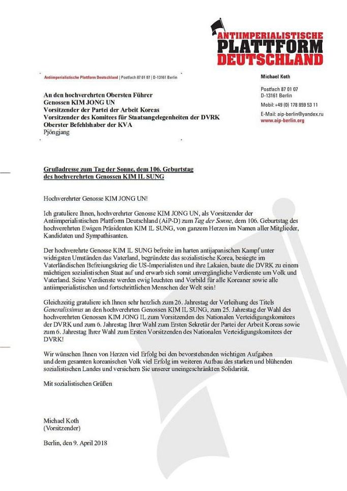 Die Antiimperialistische Plattform Deutschland (AiP-D) übermittelte dem hochverehrten Genossen Kim Jong Un ehrerbietig eine Grußadresse zum