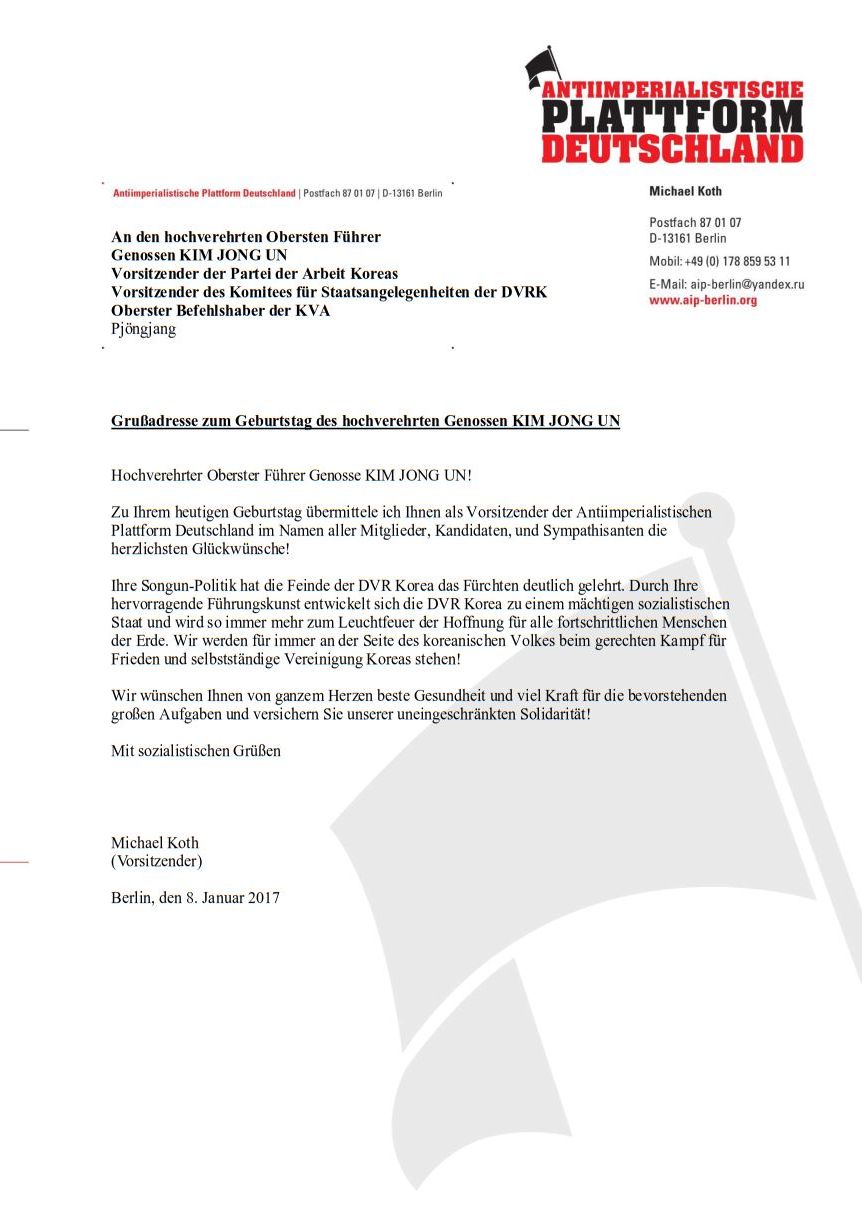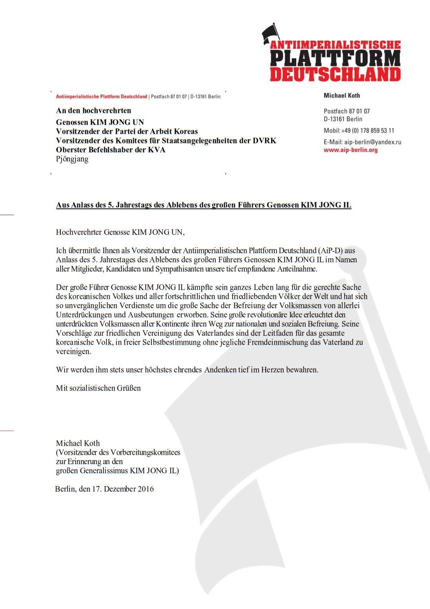 Grußbotschaft der AiP-D an Genossen Kim Jong Un