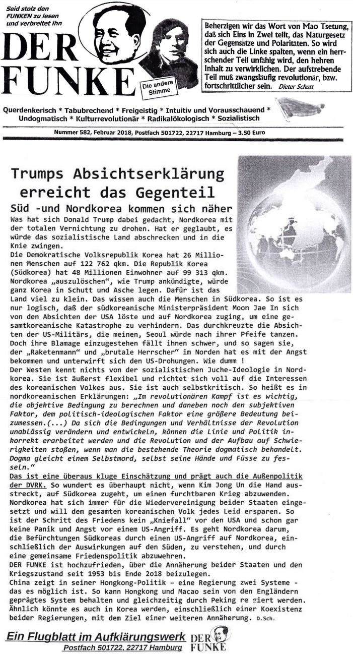 Ein Kommentar | Schlagwörter: Abonnement, AiP, AiP-D, Angriff, Antiimperialistische Plattform, Antiimperialistische Plattform Deutschland, Antiimperialistische Plattform Deutschlands, Außenpolitik, China, Demokratische Volksrepublik Korea, Der Funke, Dieter, Dieter Schütt, Donald Trump, DVR Korea, DVRK, Erich, Erich Honecker, Erich Mielke, Führer, Flugblatt, Funke, Genosse, Genossen, Gipfeltreffen, Hamburg, Heinz, Heinz Keßler, Honecker, Imperialismus, Imperialisten, Juche, Juche-Ideologie, Kampf, KDVR, Kessler, Kim Il Sung, Kim Jong Un, Kniefall, Korea, Koreanische Demokratische Volksrepublik, koreanische Halbinsel, Krieg, Mielke, Moon, Moon Jae In, Mun, Nation, Nord-Korea, Nordkorea, Politik, Präsident Trump, Revolution, Südkorea, Schütt, Souveränität, Sozialismus, Trump, Trumpel, Unabhängigkeit, US$, US-Imperialismus, USA, Vaterland, Volk, Volksmassen | Veröffentlicht inAgitprop, Analyse, Asien, BRD, Geopolitik, Gesellschaft, Imperialismus, Korea, Meldungen, Nachrichten