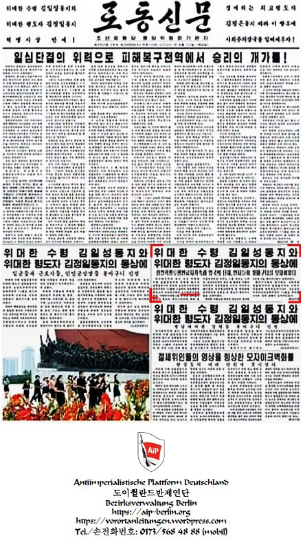 Hinterlasse einen Kommentar | Schlagwörter: AiP, AiP-D, Antiimperialistische Plattform, Antiimperialistische Plattform Deutschland, Antiimperialistische Plattform Deutschlands, Artikel, Blumenkorb, Choson, Demokratische Volksrepublik Korea, DVR Korea, DVRK, Erwähnung, Führer, Foto, Fotos, Genosse, Genossen, heute, Kampf, KCNA, KDVR, Kim Il Sung, Korea, Koreanische Demokratische Volksrepublik, Koreanische Zentrale Nachrichtenagentur, KZNA, Medien, Meldung, Minju, Nord-Korea, Nordkorea, Pjöngjang, Präsident, Pyongyang, Rodong, Sinmun, Souveränität, Sozialismus, Stimme Koreas, Unabhängigkeit, Würdigung | Veröffentlicht inAgitprop, Analyse, Asien, BRD, Europa, Geopolitik, Gesellschaft, Korea, Meldungen, Nachrichten