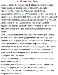 Der 23. März ist der Jahrestag der Bildung der Nationalen Liga Koreas durch den unbeugsamen revolutionären Kämpfer Kim Hyong Jik, Vater vom Präsidenten KIM IL SUNG.
