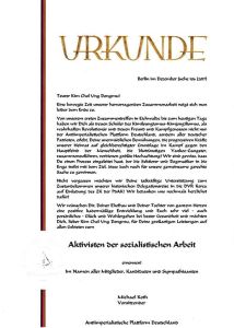 Anschließend überreichte unser Vorsitzender, der verdiente Genosse Michael Koth, auf Beschluss des Kollegiums der AiP-D unserem koreanischen Genossen die Auszeichnung (Urkunde) zum Aktivisten der sozialistischen Arbeit auf einer original DDR-Urkunde. Dies war verbunden mit der symbolischen Verleihung eines Original-Aktivistenabzeichens der DDR aus dem Jahre 1975 aus dem persönlichen Besitz unseres Vorsitzenden.