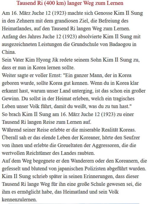 So brach KIM IL SUNG am 16. März Juche 12 (1923) zu einer Tausend Ri langen Reise zum Lernen auf.