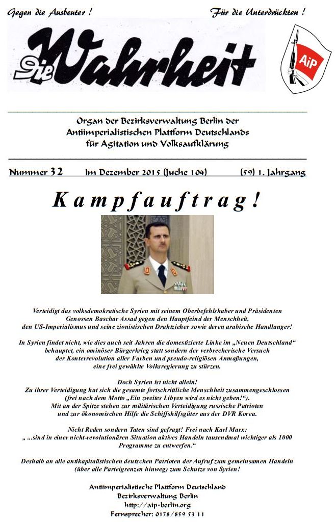 4 Kommentare | Schlagwörter: 32, al-Assad, Assad, Baschar, Baschar al-Assad, Baschar Assad, Baschar Hafiz al-Assad, Die Wahrheit, Die Wahrheit Nr. 32, Drahtzieher, Hafiz, Karl Marx, Konterrevolution, Libyen, lies Die Wahrheit, Marx, ND, Neues Deutschland, Oberbefehlshaber, Präsident, Präsident Assad, Russen, russland, US-Imperialismus, US-Imperialisten, Verteidigung, Wahrheit, Wahrheit 32, Wahrheit Nr. 32, Willst du Klarheit, Willst du Klarheit – lies „Die Wahrheit“ | Veröffentlicht inAgitprop, Asien, Geopolitik, Imperialismus, Meldungen, Nachrichten, Syrien, Willst du Klarheit – lies „Die Wahrheit“