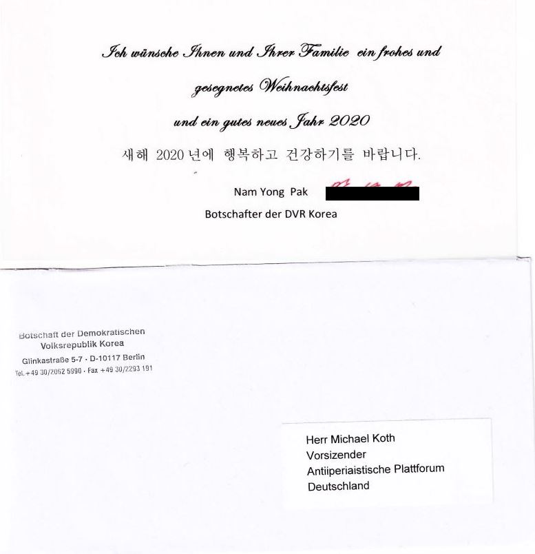 Dieser erneute Dankesbrief (s. u.) des Außerordentlichen und Bevollmächtigten Botschafters der DVR Korea in der BRD,