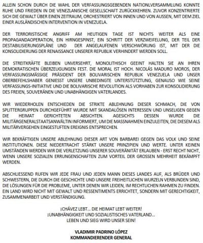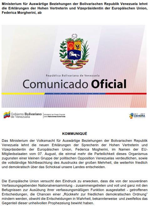 Hinterlasse einen Kommentar | Schlagwörter: Armee, Bolivarische Republik Venezuela, Botschaft Venezuela, Botschaft Venezuelas, Caracas, Demokratie, EU, Europäische Union, Frieden, Gewalt, Hugo Chávez Frías, Hugo Rafael Chávez Frías, Kommuniqués, MERCOSUR, Nicolás Maduro, Nicolás Maduro Moros, Republik Venezuela, Streitkräfte, Venezuela, Verfassungsgebende Versammlung, Versammlung | Veröffentlicht inAgitprop, Analyse, Geopolitik, Gesellschaft, Imperialismus, Meldungen, Nachrichten, Venezuela