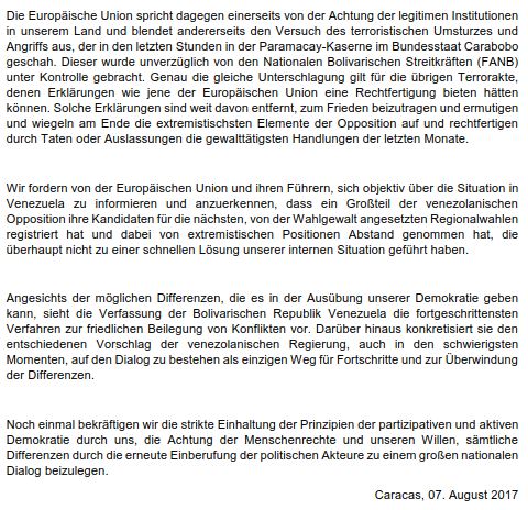 Wir verurteilen alle Versuche für die Austreibung des legitim gewählten venezolanischen Präsidenten und alle Machenschaften zur Einmischung in die inneren Angelegenheiten als Herausforderung gegen internationale Gerechtigkeit und grobe Verletzung am Völkerrecht.
