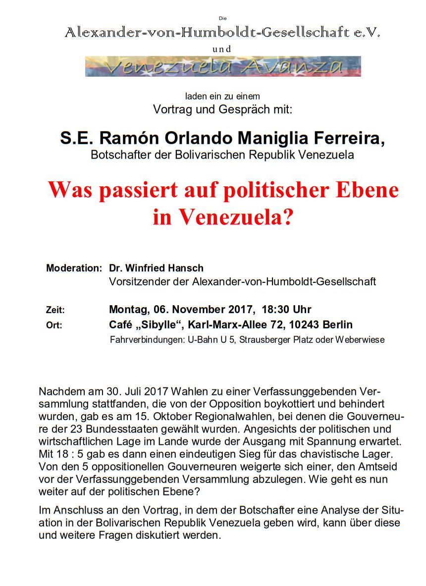 Hinterlasse einen Kommentar | Schlagwörter: Bolivarische Republik Venezuela, Botschaft Venezuela, Botschaft Venezuelas, Café Sibylle, Diskussion, Friedenspreis, Gespräch, Imperialismus, Karl-Marx-Allee 72, Konterrevolution, Konterrevolutionär, Maduro, Nicolás Maduro, Nicolás Maduro Moros, Republik Venezuela, Sacharow, Sacharow-Friedenspreis, Sibylle, Stalinallee, US$, US-Imperialismus, USA, USA-Imperialismus, Venezuela, Veranstaltung, Vortrag, Was passiert auf politischer Ebene in Venezuela? | Veröffentlicht inAgitprop, Analyse, Geopolitik, Gesellschaft, Imperialismus, Meldungen, Nachrichten, Venezuela