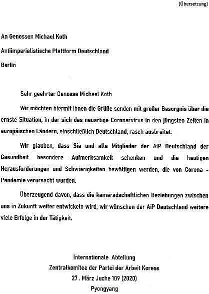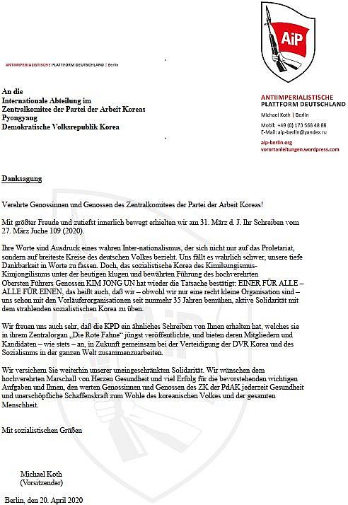 Hinterlasse einen Kommentar | Schlagwörter: 19, Abteilung, AiP, AiP-D, Antiimperialistische Plattform, Antiimperialistische Plattform Deutschland, Antiimperialistische Plattform Deutschlands, Antwort, Antwortschreiben, Corona, Covid, Demokratische Volksrepublik Korea, Dokument, DVR Korea, DVRK, 도이췰란드, 도이췰란드반제연단, 반제연단, Führer, Freude, Freundschaft, Genosse, Genossen, Imperialismus, International, Internationalismus, 평양, Juche, Juche-Ideologie, KDVR, Kim Il Sung, Kim Jong Il, Kim Jong Un, Korea, Koreanische Demokratische Volksrepublik, Koth, KPD, Michael, Nation, Nord-Korea, Nordkorea, Oberster, Organ, Partei, Partei der Arbeit Koreas, PdAK, Pjöngjang, Pyongyang, Rote Fahne, Schöwitz, Souveränität, Sozialismus, Torsten, Unabhängigkeit, Vaterland, Völkerfreundschaft, Virus, Volk, Volksmassen, Vorsitzender, Zentralkomitee, ZK | Veröffentlicht inAgitprop, Analyse, Asien, BRD, Die antiimperialistische Juche- und Songun-Solidarität wächst und erstarkt, Geopolitik, Gesellschaft, Imperialismus, Korea, Meldungen, Nachrichten
