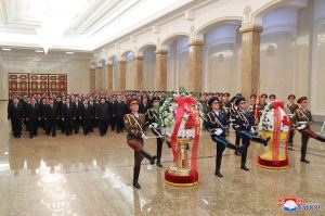 Kim Jong Un, Vorsitzender der PdAK, Vorsitzender des Komitees für Staatsangelegenheiten der DVRK und Oberster Befehlshaber der KVA, suchte zum neuen Jahr 2017 mit Ri Sol Ju den Sonnenpalast Kumsusan auf und erwies den Generalissimussen Kim Il Sung und Kim Jong Il seine hehre Ehrerbietung.