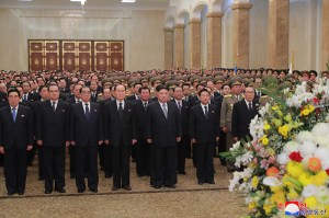 Er trat zusammen mit verantwortlichen Funktionären der Partei, des Staates und der Armee in die Halle ein, in der die Standbilder von Kim Il Sung und Kim Jong Il sind.
