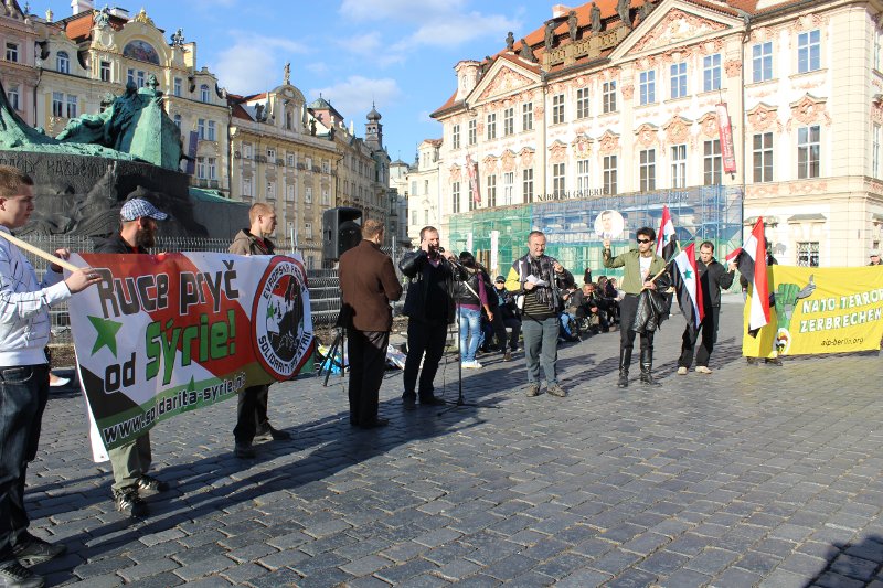 Die Kundgebung begann kurz nach 15 Uhr in mitten des sonnigen Platzes am Jan-Hus-Denkmal an der Staroměstské náměstí, der voll von Passanten und Sonntagsspaziergängern war. Alle Teilnehmer waren mit Transparenten, Fahnen und Winkelementen ausstaffiert. Eröffnet wurde die Veranstaltung von Patrik Vondrak (ESFS), der zunächst auf die Ausdehnung der Aktivitäten der ESFS zu sprechen kam. Mittlerweile verbreitet sich die Solidaritätsfront über verschiedene europäische Länder im zweistelligen Bereich und die Kontakte nach Damaskus sind eng und herzlich. Vor wenigen Wochen war eine Abordnung der ESFS in Syrien zu Besuch, wobei unter anderen die syrischen Streitkräfte besucht wurden.