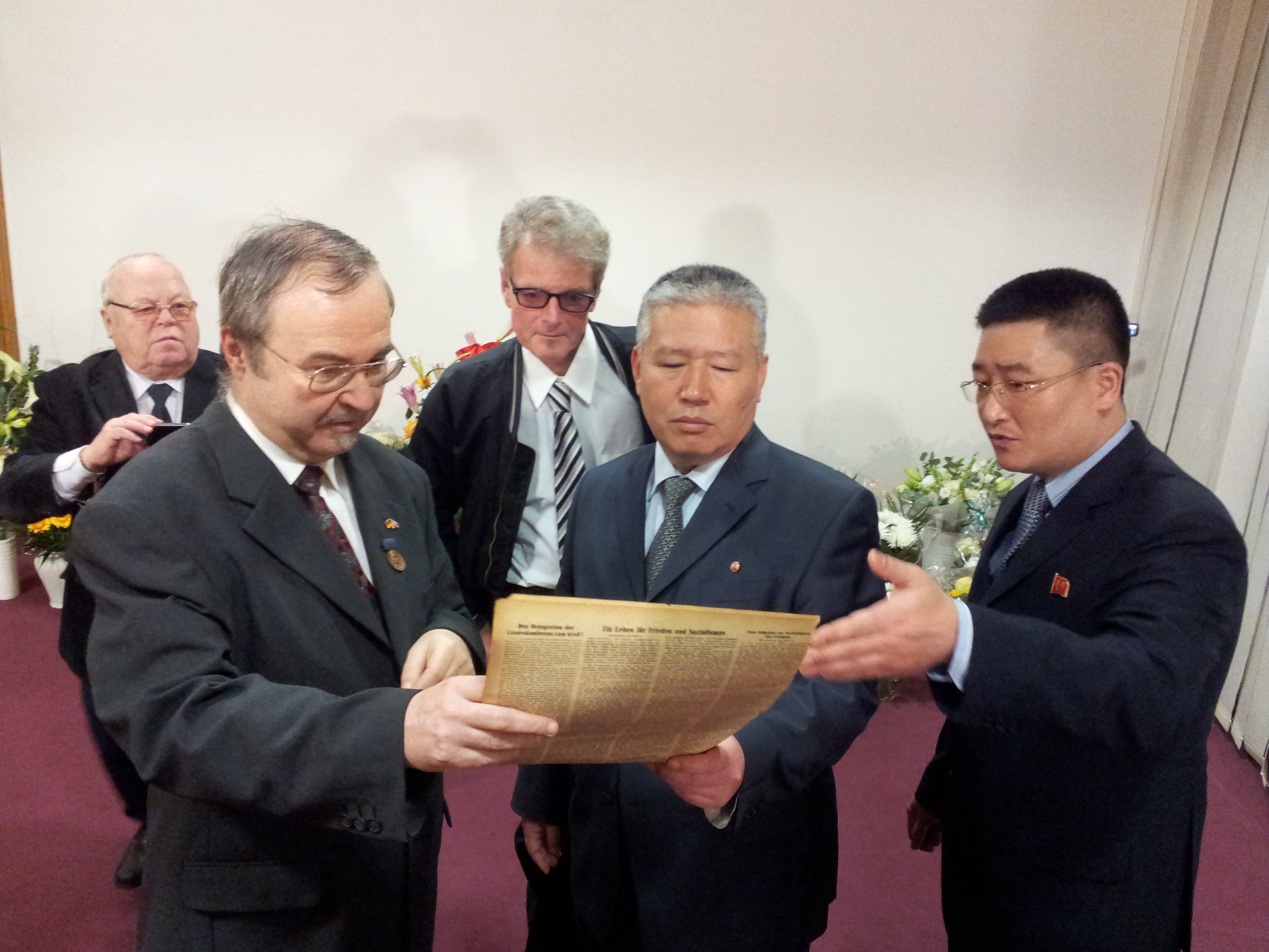 Der Botschafter dankte in einer Rede für die gute Zusammenarbeit mit unserer Organisation und wies auf die komplizierte internationale Lage, ausgelöst durch die verbrecherischen Machenschaften der US-Imperialisten, der südkoreanischen Marionetten und anderer Lakaien, hin. Er bezog sich explizit auf die Neujahrsansprache des Genossen Kim Jong Un, in der die Hand der Versöhnung Richtung Südkorea ausgestreckt wurde. Genosse Michael Koth dankte S.E. dem Botschafter für den warmherzigen Empfang und die Atmosphäre tiefer brüderlicher Verbundenheit. Er betonte, dass sich unsere Organisation als Fortsetzer der Traditionen des Antiimperialistischen Solidaritätskomitees der DDR, das unter Leitung von Genossen Kurt Seibt (ZK der SED) stand, sieht und unter völlig anderen gesellschaftlichen Verhältnissen heute die Fahne der internationalen Solidarität hoch hält. In allen behandelten Fragen wurde völlige Übereinstimmung erzielt.