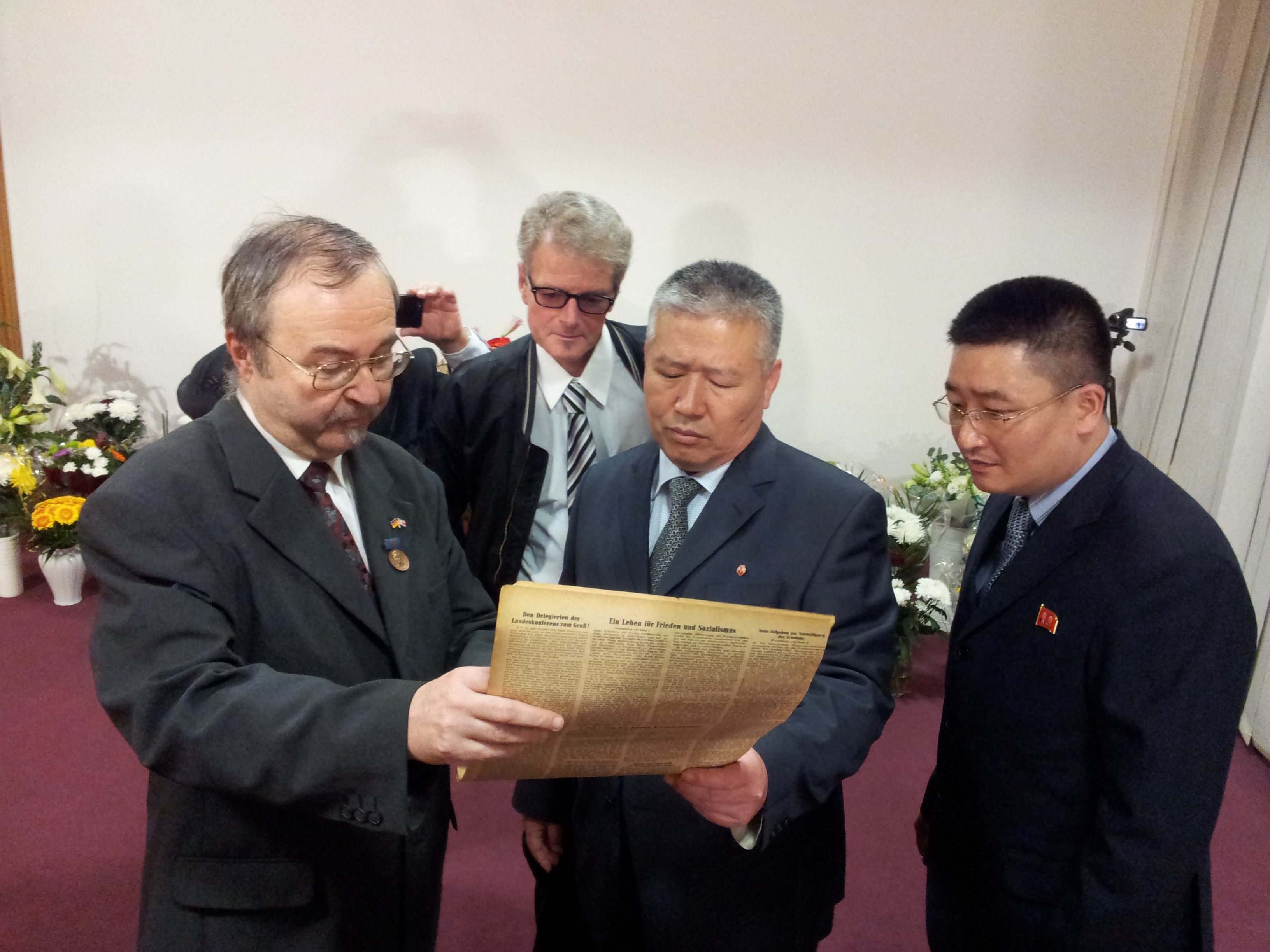 Der 3. Jahrestag des Ablebens einer Person ist in Korea traditionell der Abschluss der erweiterten Trauerfrist. Es war für uns die höchste Ehre, unsere Trauer und unser Beileid zu bekunden. Wir überreichten dem Außer- ordentlichen und Bevollmächtigten Botschafter der DVRK in der BRD Genossen Ri Si Hong eine Grußbotschaft an den hochverehrten Genossen Kim Jong Un im Namen aller Mitglieder, Kandidaten und Sympathisanten der AiP-D. Als Höhepunkt gestaltete sich wiederum die Übergabe von zwei Original-Zeitungen des SED-Organs für Mecklenburg aus dem Jahre 1950, in dem voller Begeisterung über den Siegeszug der heroischen Koreanischen Volksarmee (KVA) berichtet wurde. Wir gaben das Versprechen, bei zukünftigen Gelegenheiten weitere historisch wichtige Dokumente der deutsch-koreanischen Freundschaft und Waffenbrüderschaft zu überreichen. S. E., Genosse Botschafter Ri Si Hong, dankte sehr herzlich für die solidarische Verbundenheit mit dem koreanischen Volk.