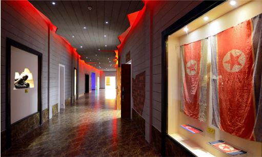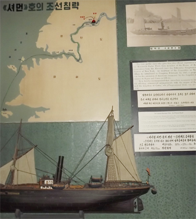 Am Eingang der Ausstellung steht ein Modell vom Aggressionsschiff „General Sherman“, ein Beweismittel über die Verbrechen der USA, die schon früh in das Korea einzudringen versuchten. Führerin Kim Son Hui im Zentralen Museum für klassenmäßige Erziehung sagt; „Die USA-Aggressoren drangen im Jahr 1866 mit diesem Schiff bis in den Fluss Taedong ein. Seitdem begann die Aggression der USA gegen Korea.“