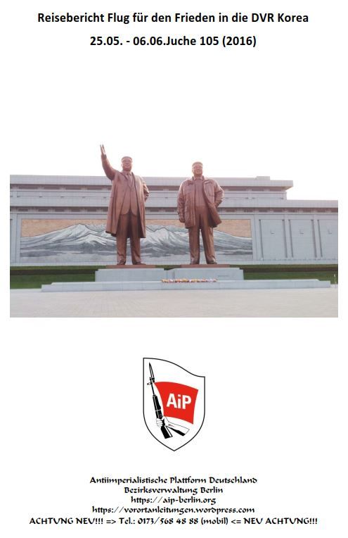 Ein Kommentar | Schlagwörter: 1. Teil, 2. Teil, 2016, 3. Teil, AiP, AiP-D, Antiimperialistische Plattform, Antiimperialistische Plattform Deutschland, Antiimperialistische Plattform Deutschlands, Armee, Bericht, Dank, Danke, Delegation, Delegationsmitglieder, Delegationsreise, Demokratische Volksrepublik Korea, DVR Korea, DVRK, Einladung, Entschuldigung, Führer, Genosse, Genossen, GLB, herunterladen, Ideologie, Imperialismus, Jangchon, Juche, Juche-Ideologie, Kaesong, Kampf, KDVR, Kim Il Sung, Kim Jong Il, Kim Jong Un, Kommunismus, Kommunisten, Korea, Koreanische Demokratische Volksrepublik, Koreanische Volksarmee, Kreis Sinchon, KVA, Mangjongdä, Mangyongdae, Massaker von Sinchon, Meinungen, Museum, Museum Sinchon, Nation, Nord-Korea, Nordkorea, Panmunjeom, Panmunjom, Partei der Arbeit Koreas, PdAK, pdf, PDF-Datei, PDF-Dateien, Phanmunjeom, Phanmunjom, Pjöngjang, Pyongyang, Reise, Reisebericht, Reisebericht der AiP-D von der Delegationsreise 2016 in die DVR Korea, Revolution, Südkorea, Sinchon, Songun, Songun-Revolution, Souveränität, Sozialismus, Stellungnahmen, Unabhängigkeit, US-Imperialismus, USA, Vaterland, Volk, Volksmassen, von der Delegationsreise, Zentralkomitee, Zentralkomitee der Partei der Arbeit Koreas, Zentralkomitee der PdAK, ZK | Veröffentlicht inAgitprop, Analyse, Asien, Geopolitik, Gesellschaft, Historische Dokumente, Imperialismus, Korea, Meldungen, Nachrichten