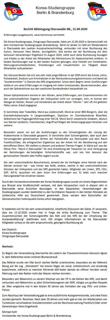 Hinterlasse einen Kommentar | Schlagwörter: AiP, AiP-D, Aktivtagung, Antiimperialistische Plattform, Antiimperialistische Plattform Deutschland, Antiimperialistische Plattform Deutschlands, Becker, Buch, Buchlesung, Demokratische Volksrepublik Korea, DVR Korea, DVRK, Eberswalde, Genosse, Genossen, Hans, Imperialismus, Kampf, KDVR, Korea, Koreanische Demokratische Volksrepublik, Lesung, MDI, MfS, Ministeriums für Staatssicherheit, Nord-Korea, Nordkorea, Revolution, Sonderermittler, Souveränität, Sozialismus, Treffen, Unabhängigkeit, Vaterland, Volk | Veröffentlicht inAgitprop, Analyse, BRD, Geopolitik, Gesellschaft, Imperialismus, Korea, Meldungen, Nachrichten