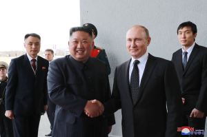 Genosse KIM JONG UN, Vorsitzender der PdAK, Vorsitzender des Komitees für Staatsangelegenheiten der DVR Korea und Oberster Befehlshaber der Streitkräfte der DVR Korea, mit W. W. Putin, Präsidenten der Russischen Förderation, und führte mit ihm Verhandlung.