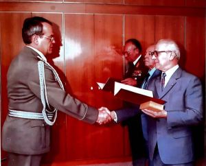 Genosse Erich Honecker überreicht Genossen Engelhardt seine Beförderungsurkunde zum Generalmajor des MfS