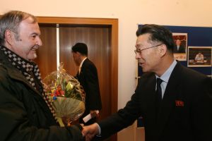 Genossen KIM IL SUNG in schwierigen Zeiten gefeiert hatten. Er verwies in diesem Zusammenhang auf die Jahre 1989/90 (Konterrevolution in der DDR) und 1996-99 (Zeit des Schweren Marsches). Danach ergriff der Vertreter des Traditionsverbandes der NVA-GT das Wort und stellte seine Organisation und ihre Geschichte vor. Er verwies ausdrücklich darauf, dass die Werbung für das KFL kein Zufall war, sondern ein klares Bekenntnis zur Freundschaft zwischen der fortschrittlichen Jugend Deutschlands und der DVR Korea, getreu bester Traditionen, er verwies nur kurz auf die „deutsche Stadt“ Hamhung… Nach dem Motto „… und der Zukunft zugewandt…“ erklärte der Genosse Offizier „Klassenbrüder werden immer Waffenbrüder bleiben — heute im ideologischen Bereich“. Der Dresdener Genosse berichtete über den kontinuierlichen Kampf, gegen der Lüge und Hetze über die DVRK entgegenzutreten, und dafür die Wahrheit über den sozialistischsten Staat der Erde zu verbreiten.