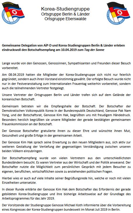 Zum Tag der Sonne, dem 108. Geburtstag des hochverehrten Ewigen Präsidenten KIM IL SUNG, trafen sich in der Botschaft der DVR Korea in der BRD der Vorsitzende der Antiimperialistischen Plattform Deutschland (AiP-D) Michael Koth, der Stellvertretende Vorsitzende des Traditionsverbandes der NVA-GT, Genosse Major …, ein führendes Mitglied der Juche-Studiengruppe Dresden, der Vorsitzende der Juche-Studiengruppe Berlin und Bürger aller Klassen und Schichten zu einer Festveranstaltung.