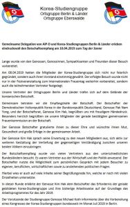 Auch die Antiimperialistische Plattform Deutschland hat den Tag der Sonne zum Anlass genommen, ein deutliches Zeichen, sinnbildend für das enge und freundschaftliche Band zwischen dem Volk der Demokratischen Volksrepublik Korea und den fortschrittlichen Kräften in Deutschland, zu setzen.