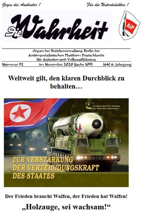 Hinterlasse einen Kommentar | Schlagwörter: 92, Abgeordnete, AiP, AiP-D, Altmaier, Antiimperialistische Plattform, Antiimperialistische Plattform Deutschland, Antiimperialistische Plattform Deutschlands, Armee, Aufrüstung, Beitrag, Bolton, Bundestag, Demokratische Volksrepublik Korea, Deutschland, Die Wahrheit 92, DVR Korea, DVRK, Fantasien, Führer, Frieden, Gäste, Genosse, Genossen, Holzauge, Imperialismus, Kampf, KDVR, Kim Il Sung, Kim Jong Il, Kim Jong Un, Korea, Koreanische Demokratische Volksrepublik, Koreanische Volksarmee, Krieg, KVA, Lügen, Lügenmedien, Lügenpresse, Lenin, Nation, Nord-Korea, Nordkorea, Oberster Führer, Panik, Partei, Partei der Arbeit Koreas, PdAK, Pjöngjang, Politik, Pompeo, Propaganda, Provokation, Provokationen, Pyongyang, Rüstung, Reichstag, Revolution, Souveränität, Sozialismus, Stalin, Trump, Unabhängigkeit, US, US-Imperialismus, USA, Vaterland, Volk, Volksmassen, Waffen, Wahrheit | Veröffentlicht inAgitprop, Analyse, Asien, BRD, Europa, Geopolitik, Gesellschaft, Imperialismus, Korea, Meldungen, Nachrichten