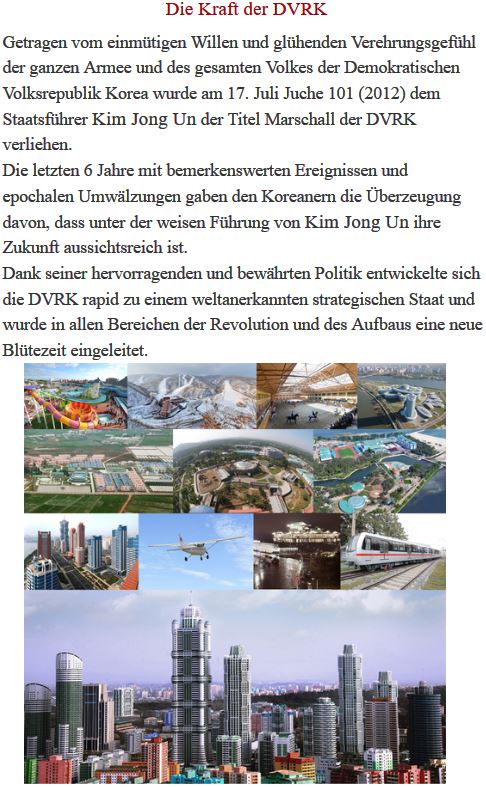 Die Botschaft der DVR Korea hat am Fr, den 17.07.2015 das Bulletin Nr. 34-2015 zum heutigen 3. Jahrestag der Verleihung des Titels Marschall der DVRK an den hochverehrten Genossen Kim Jong Un herausgegeben. Wir wollen unseren Freunden und Genossen das Dokument nicht vorenthalten: