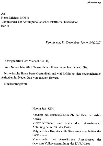 Ein Kommentar | Schlagwörter: 2021, AiP, AiP-D, an alle, Antiimperialistische Plattform, Antiimperialistische Plattform Deutschland, Antiimperialistische Plattform Deutschlands, Auswärtiger Ausschuss, Botschaft, Botschafter, Botschaftsrat, Demokratische Volksrepublik Korea, DVR Korea, DVRK, E-Mail, E-Post, eMail, Führer, Genosse, Genossen, Glückwünsche, Grußkarten, Juche, Juche 110, Juche-Ideologie, Kampf, Kandidat, KDVR, Kim Hak, Kim Hyong Jun, Kim Ung Son, Komitee für Staatsangelegenheiten, Korea, Koreanische Demokratische Volksrepublik, Koth, KPEA, Michael, Mitglied, Nation, Neujahrsgrüße, Nord-Korea, Nordkorea, Oberste Volksversammlung, Pak Jong Su, Partei, Partei der Arbeit Koreas, PdAK, Pjöngjang, Pyongyang, Revolution, Souveränität, Sozialismus, Studiengruppe, Unabhängigkeit, Vaterland, Verbalnote, Vizevorsitzender, Vorsitzender, ZK | Veröffentlicht inAgitprop, Analyse, Asien, BRD, Geopolitik, Gesellschaft, Korea, Meldungen, Nachrichten
