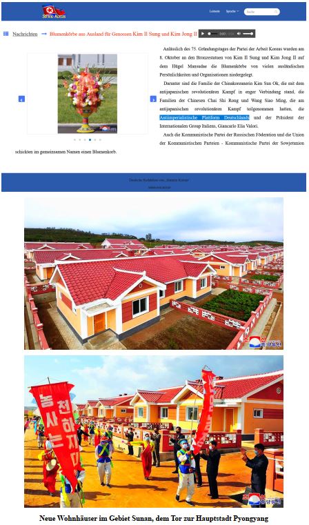 Zum 75. Gründungstag der Partei der Arbeit Koreas widmete die Antiimperialistische Plattform Deutschland (AiP-D) einen Blumenkorb für die Statuen der großen Führer Genossen KIM IL SUNG und KIM JONG IL. Hierüber berichtete heute die Stimme Koreas:
