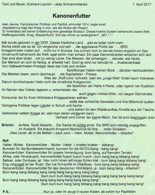 Hinterlasse einen Kommentar | Schlagwörter: Autor, Brüder, BRD, Bundeswehr, Deutschland, Eckhardt, Hartz, Imperialismus, IV, Junge, JW, Kanonenfutter, Krieg, Kriege, Laurich, Lieder, Musik, Mutter, Nato, Oktoberklub, Pazifismus, Pazifisten, Revolution, Rotfuchs, Schrammel, Schrammelecke, Souveränität, Sozialismus, Strophe, Text, Unabhängigkeit, US$, US-Imperialismus, USA, Vater, Welt | Veröffentlicht inAgitprop, Analyse, BRD, Geopolitik, Gesellschaft, Imperialismus, Meldungen, Nachrichten