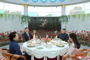 Der hochverehrte Oberste Führer Genosse KIM JONG UN, Vorsitzender der Partei der Arbeit Koreas und Vorsitzender des Komitees für Staatsangelegenheiten der Demokratischen Volksrepublik Korea, besuchte die Unterkunft von Xi Jinping, Generalsekretär des Zentralkomitees der Kommunistischen Partei Chinas und Präsidenten der Volksrepublik China, und gab zu Ehren des chinesischen Präsidenten und seiner Frau Peng Li Yuan das Mittagsmahl. Sie besuchten weiterhin den Turm der Freundschaft und legten einen Blumenkorb nieder. Auf dem Pyongyanger Flughafen wurden die Gäste schließlich herzlich verabschiedet.