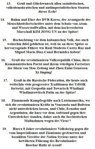 zum 100. Gründungstag der Kommunistischen Partei Chinas sende ich in Namen aller Parteimitglieder der Partei der Arbeit Koreas, des koreanischen Volkes und von mir selbst Ihnen, verehrtem Genossen Generalsekretär Xi Jinping, allen Parteimitgliedern der KP Chinas und dem brüderlichen chinesischen Volk herzlichen Glückwunsch und warme kameradschaftliche Grüße.
